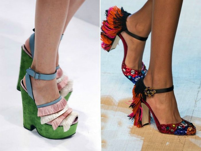 Бахрома, которая была модной в прошлом году, плавно перекочевала из одежды на обувь. Поэтому самые смелые и экстравагантные личности могут рискнуть и примерить этой весной яркие босоножки, украшенные разноцветной бахромой, которые станут стильной деталью летнего образа.