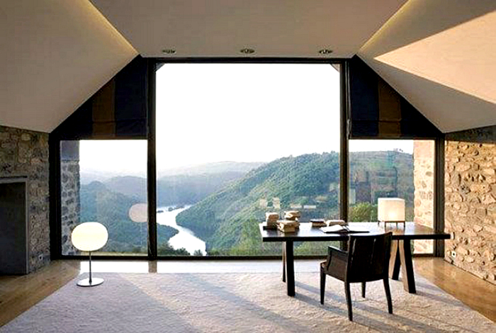 Вдохновляющее пространство с небольшим рабочим столом и огромным панорамным окном, из которого открывается восхитительный вид на долину.