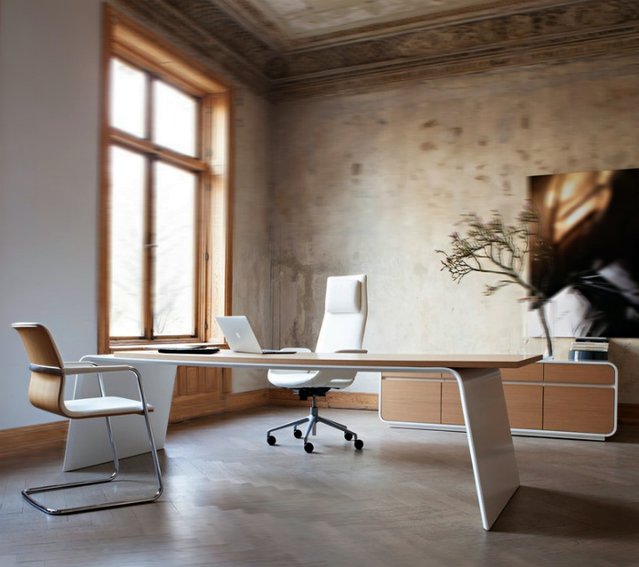 Светлый и просторный домашний офис в стиле минимализм, изюминкой которого стал большой футуристический стол необычной формы.